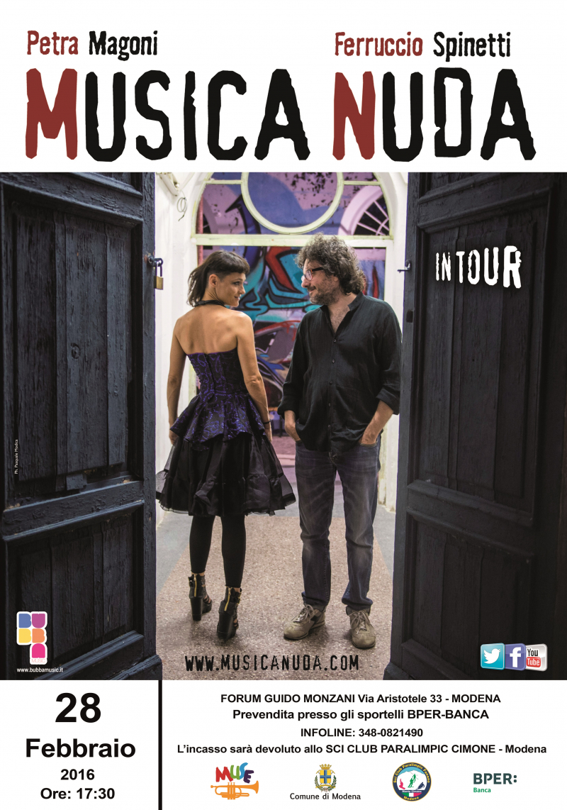 Un incontro fortuito voluto dal destino quello tra Petra Magoni e Ferruccio Spinetti, duo che risponde al nome di Musica Nuda. Cantante solista con all’attivo già quattro album, nel gennaio 2003 Petra Magoni aveva in programma un mini-tour in alcuni piccoli club della sua Toscana con un amico chitarrista. Proprio il giorno del loro primo concerto, quest’ultimo si ammala. Petra, invece di annullare la data, chiede a Ferruccio, già contrabbassista degli Avion Travel, di sostituirlo all’ultimo minuto. Il concerto ottiene un tale successo che i due protagonisti di questo Voice’n’bass combo, nel giro di qualche settimana, mettono insieme un intero repertorio composto dalle canzoni che più amano e di slancio registrano in una sola giornata il loro primo album Musica Nuda, titolo che darà poi il nome anche al loro duo.