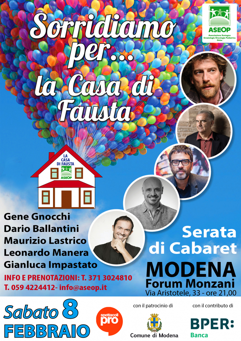 Un appuntamento imperdibile di risate e solidarietà. Insieme a Gene Gnocchi, Dario Ballantini, Maurizio Lastrico, Leonardo Manera e Gianluca Impastato vi aspettiamo numerosissimi per regalare un sorriso alle famiglie della Casa di Fausta e a tutti i nostri bambini.