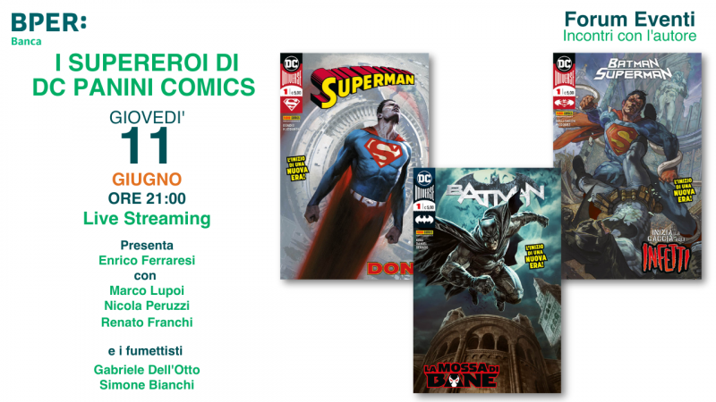 Le avventure (vecchie e nuove) di Batman, Superman, Wonder Woman e compagni hanno cambiato editore: domani Marco Lupoi, Nicola Peruzzi e Renato Franchi della Panini Comics presentano le nuove collane dedicate ai supereroi, con tante cover d’autore. La parola ai disegnatori Simone Bianchi e Gabriele Dell’Otto. L’appuntamento è alle 21 in diretta sulla pagina facebook “BPER Forum Monzani” e sul sito del Forum.