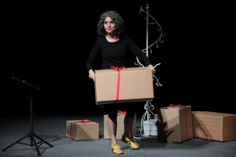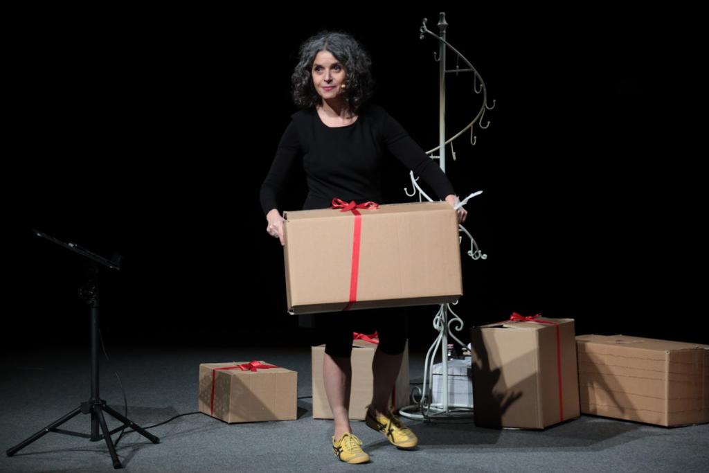 Conosco due bambini che conservano dentro scatole i ricordi di ogni viaggio. Cose più diverse: biglietti, cartoline, incarti di merende, sassi, di tutto. Ogni viaggio, una scatola. Poi, di tanto in tanto, ne tirano fuori una e si raccontano quel viaggio, quel museo, quel ristorante, quella merenda che lì era diversa. Quelle cose diventano le parole del loro racconto. Anche le storie sono viaggi, ci permettono di partecipare a partite di calcio galattiche, di conoscere nonnine che tessono mondi nuovi e principesse con strani problemi, ci fanno volare e diventare grandi. In scena tante scatole, ogni scatola, una storia. Pina Irace, attrice, si è avvicinata al teatro molto giovane proseguendo nell’attività professionale dopo il percorso di studi compiuti a Roma. Ha spaziato in generi diversi, dalla tragedia greca alla commedia musicale, dalla drammaturgia contemporanea al teatro classico napoletano. Durante il lungo periodo romano ha partecipato come attrice e autrice a cortometraggi che hanno aderito a diversi festival, ha fatto incursioni radiofoniche e ha regalato storie. Attualmente vive a Reggio Emilia dove svolge laboratori di teatro e di lettura per bambini e narrazioni. Altra sua grande passione è la scrittura e la letteratura per l’infanzia, ha pubblicato con Zoolibri editore gli albi illustrati “Il Domatore di foglie” e “Il sole col singhiozzo” tradotti anche in Cina, Giappone, Danimarca, Israele, Corea e Brasile