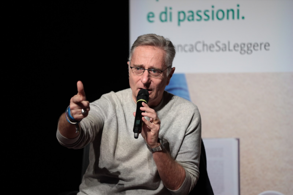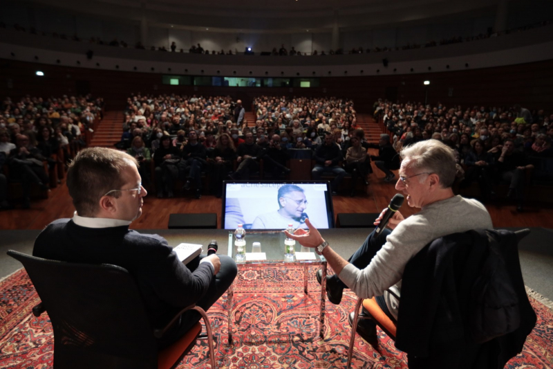 Una notte di maggio del 2023, un anonimo appartamento romano che s’affaccia sul fiume, un dialogo serrato fra marito e moglie che si protrae fino all’alba. Come in un dramma da camera, Paolo Bonolis mette in scena il confronto diretto con la propria coscienza per proporci una riflessione intima e collettiva, lucida e provocatoria, sui temi che interrogano l’umanità ieri come oggi, dalle illusioni della religione alle mistificazioni del potere, fino a toccare i nervi scoperti di una società ipertecnologica che ha delegato all’intelligenza artificiale il controllo dei nostri figli, esponendoli ai rischi di un presente senza memoria e un futuro senza libertà. Un uomo e una donna, marito e moglie, escono da un “apericena” e si avviano a piedi verso casa. Era tanto che non passeggiavano insieme e l’occasione è quella di parlare a ruota libera. A lei fanno male le scarpe, ma lui le trova seducenti. Dalle minime cose si fa in fretta a passare ai massimi sistemi. Il Cupolone, cioè la Chiesa, ci opprime o ci incanta? L’Onnipotente: chi è o cos’è? Quando arrivano a casa, il dialogo serrato non si interrompe e basta gettare lo sguardo nella stanza del figlio, al momento in gita scolastica, per veder sorgere delle preoccupazioni, tra un poster di Sfera Ebbasta e un paio di sneakers dal prezzo astronomico. Da lì, marito e moglie tornano su loro stessi e sulle reciproche gelosie. Lo scambio di battute lascia senza fiato e intanto i due mangiano, bevono, fanno l’amore. E riprendono a parlare di tutto. Per tutta la notte. Fino al mattino.