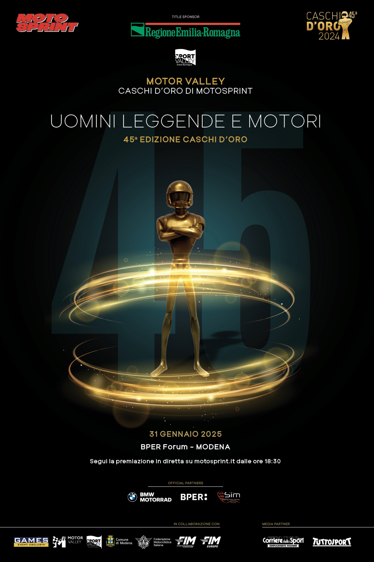 Motosprint e BPER ti offrono la possibilità di partecipare alla 45ª edizione dei Caschi d’Oro che si terrà il 31 gennaio 2025 alle ore 18.30 presso il BPER Forum a Modena.